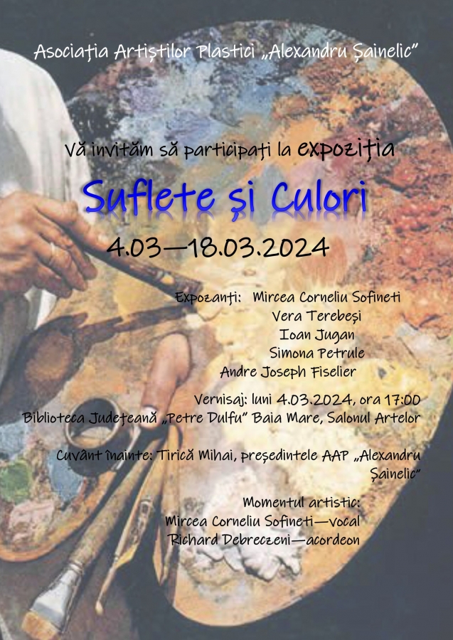 Asociația Artiștilor Plastici „Alexandru Șainelic” în colaborare cu Biblioteca Județeană „Petre Dulfu” Baia Mare organizează luni, 4 martie, orele 17.00, în Salonul Artelor, vernisajul expoziției de grup, „Suflete și culori.” Vor expune tablouri membrii asociației: Vera Terebeși, Simona Petrule, Mircea Corneliu Sofineti, Ioan Jugan, Andre Joseph Fiselier.