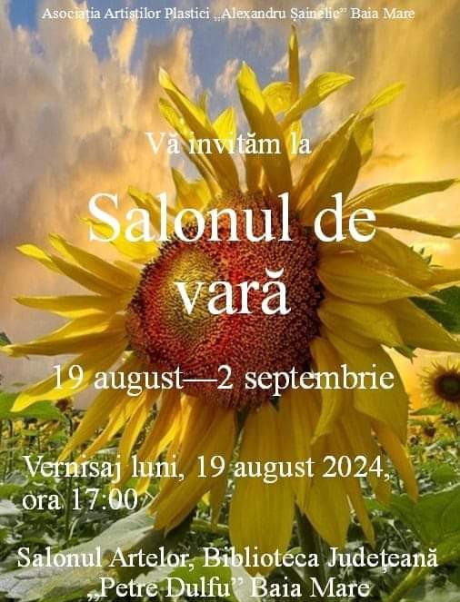 Iubitorii de artă și frumos sunt așteptați să calce pragul Bibliotecii Județene „Petre Dulfu”, luni, 19 august 2024, orele 17.00, în Salonul Artelor. Acolo va avea loc vernisajul expoziției „Salonul de vară”.