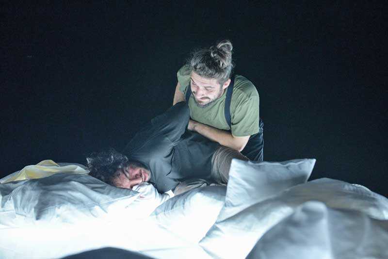 exteriorizarea conflictelor nerezolvate. Suntem martorii unei realități în care ficțiunea deține rolul dominant, într-o țară dictatorială imaginară. Ce se ascunde în spatele unor povestiri noir? O copilărie nefericită, părinți devianți, relații tensionate ? Cum sunt exorcizați demonii interiori şi cum ies la suprafață în viața de zi cu zi ? Acestea sunt întrebările la care spectacolul „Omul Pernă” încearcă să răspundă.”