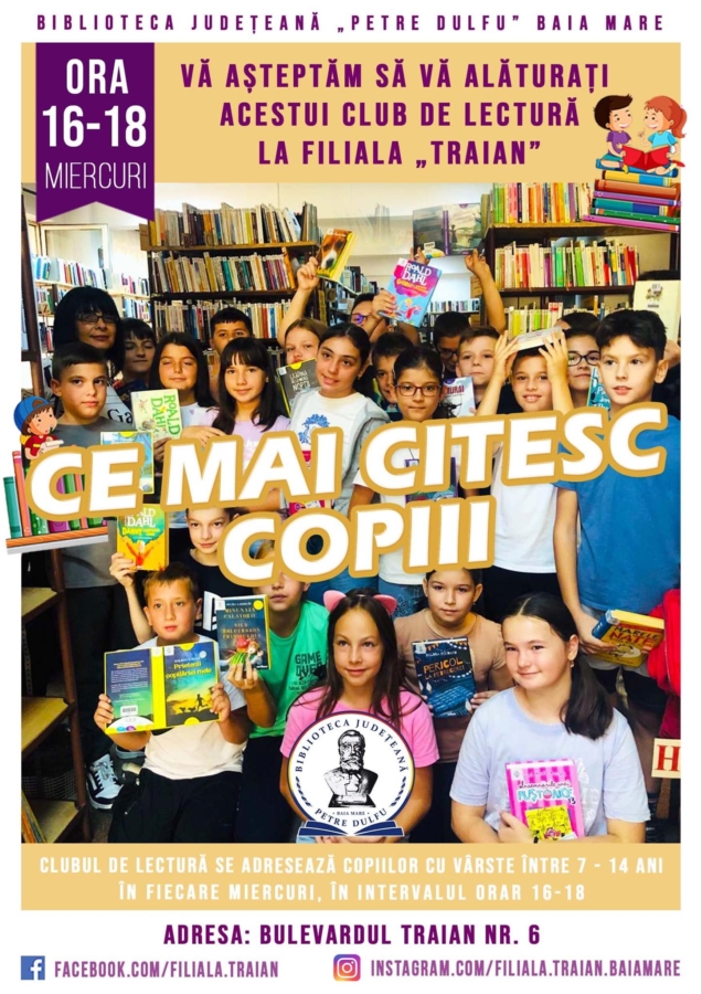 Filiala Traian a Bibliotecii Județene „Petre Dulfu” organizează miercuri, 7 august, între orele 16.00-18.00, clubul de lectură „Ce mai citesc copiii”. Acesta se adresează copiilor cu vârste între 7 și 14 ani și va funcționa săptămânal, în aceeași zi și același interval orar.