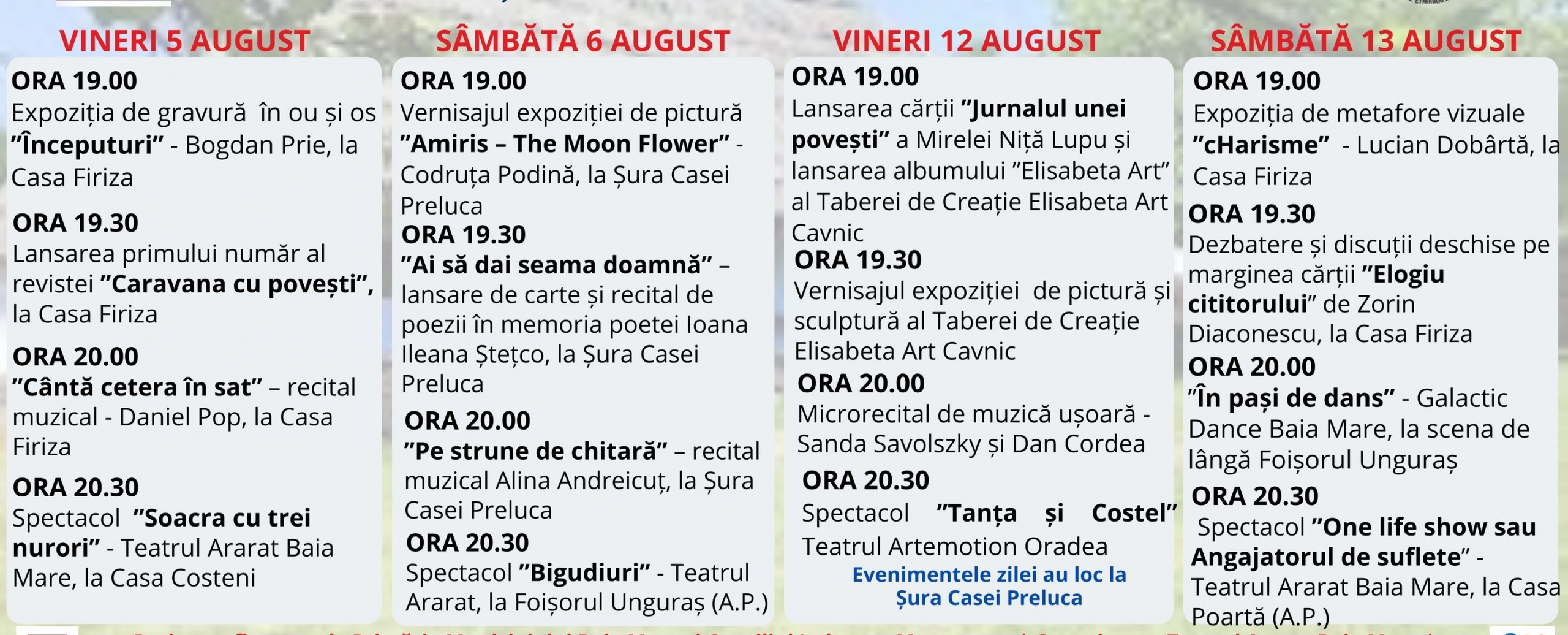 În perioada 5 – 13 august, în fiecare zi de vineri și sâmbătă, în incinta Muzeului Satului din Baia Mare, începând cu ora 19.00, se desfășoară Festivalul Artelor “Repere, Mituri, Identități”, ediția a VI- a.