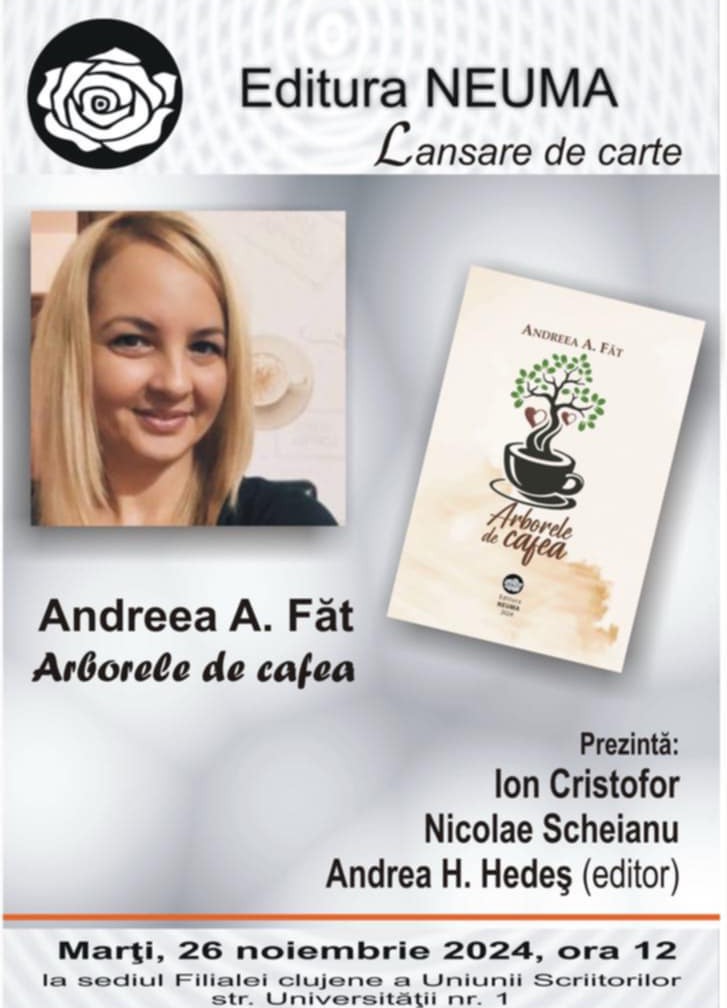 Marți, 26 noiembrie, ora 12.00, la sediul Filialei clujene a Uniunii Scriitorilor Cluj Napoca va avea loc lansarea cărții „Arborele de cafea” a autoarei Andreea A, Făt.