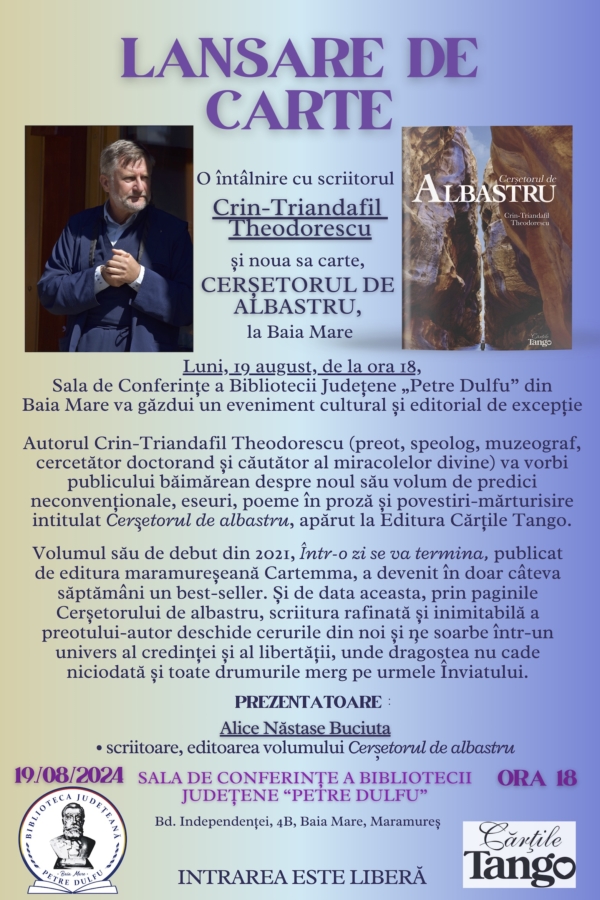 Luni, 19 august, de la ora 18, în Sala de Conferințe a Bibliotecii Județene „Petre Dulfu” din Baia Mare va avea loc un eveniment cultural și editorial de excepție. Autorul Crin-Triandafil Theodorescu (preot, speolog, muzeograf, cercetător doctorand și căutător al miracolelor divine) va vorbi publicului băimărean despre noul său volum de predici neconvenționale, eseuri, poeme în proză și povestiri-mărturisire intitulat „Cerșetorul de albastru”, apărut anul acesta la Editura „Cărțile Tango”.