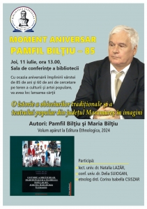 Joi, 11 iulie, ora 13.00, în Sala de Conferințe a Bibliotecii Județene „Petre Dulfu” va avea loc lansarea cărții „O istorie a obiceiurilor tradiționale și a teatrului popular din județul Maramureș în imagini”. Tot în cadrul acestui eveniment se marchează „Moment aniversar Pamfil Bilțiu-85”, aniversarea împlinirii vârstei de 85 de ani și 60 de ani de cercetare a culturii și artei populare.