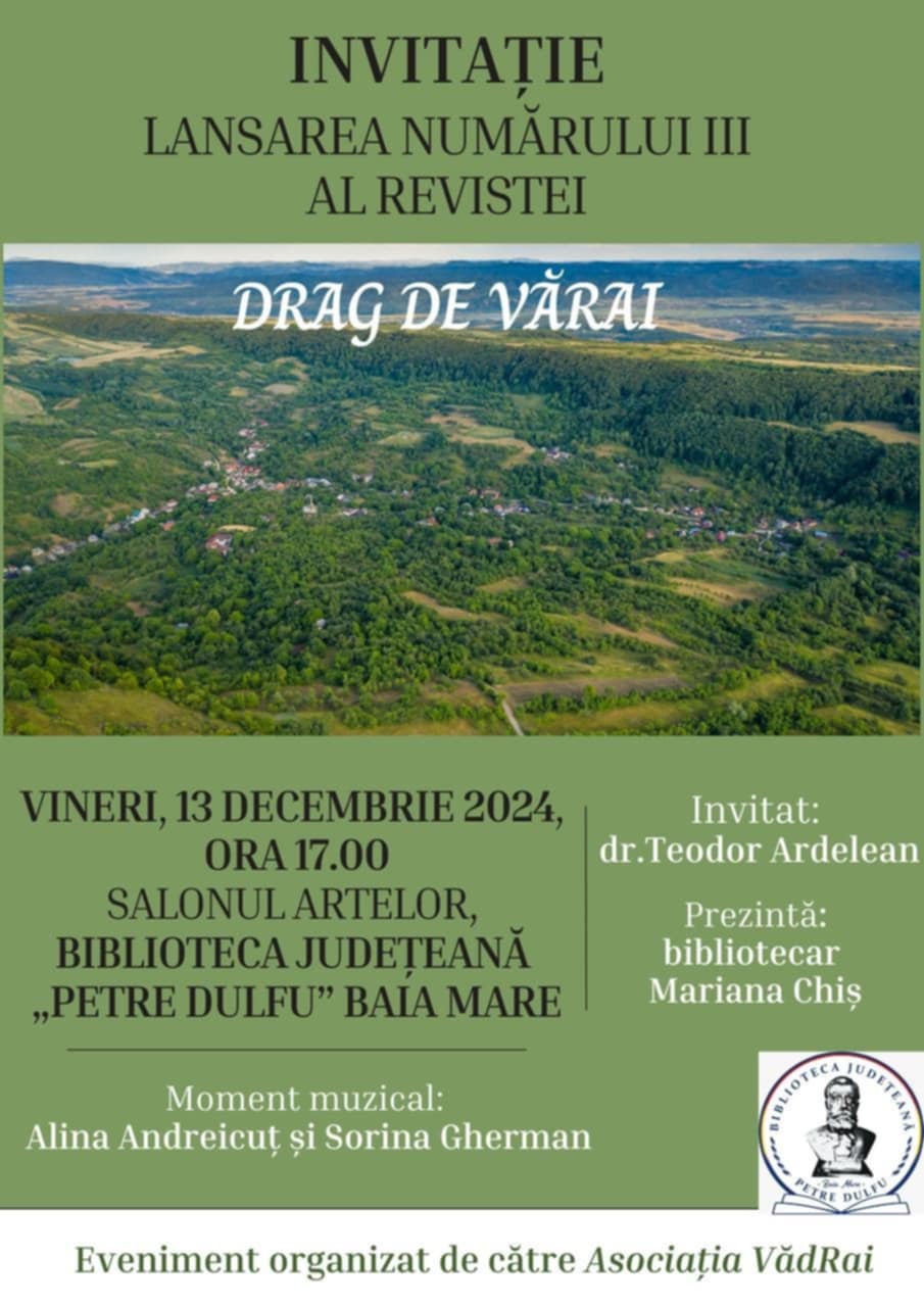 Vineri, 13 decembrie, ora 17.00, în Salonul Artelor al Bibliotecii Județene „Petre Dulfu” Baia Mare, Asociația VăDrai din Vărai organizează în colaborare cu instituția gazdă lansarea celui de-al 3-lea număr al Revistei „Drag de Vărai”.