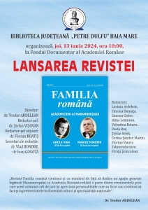 Biblioteca Județeană „ Petre Dulfu” Baia Mare organizează joi, 13 iunie 2024, ora 10.00, la Fondul Documentar al Academiei Române, lansarea celui mai recent număr, 1-8 (84-91) 2022-2023, al revistei pentru solidaritatea românilor de pretutindeni „Familia română”. Acesta este dedicat personalităților care au făcut istorie de-a lungul anilor și în zilele noastre, și legătura indestructibilă a ținutului Maramureșului cu Academia Română.