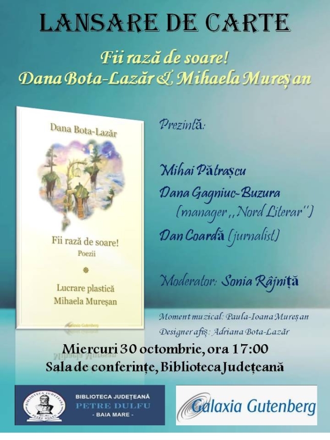 Miercuri, 30 octombrie, ora 17.00, în Sala de conferințe a Bibliotecii Județene „Petre Dulfu” Baia Mare va avea loc lansarea volumului de poezii „Fii rază de soare!”, de Dana Bota-Lazăr. Evenimentul va fi organizat în colaborare cu instituția gazdă și Editura Galaxia Gutenberg Târgu Lăpuș, unde a apărut cartea. Ilustrația aparține Mihaelei Mureșan.