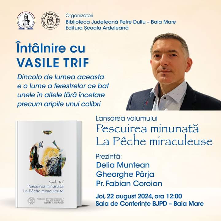Joi, 22 august 2024, orele 12.00, în Sala de conferințe a Bibliotecii Județene „Petre Dulfu” Baia Mare va avea loc întâlnirea cu poetul Vasile Trif și lansarea volumului de poezii bilingv „Pescuirea minunată”/ La Pêche miraculeuse”