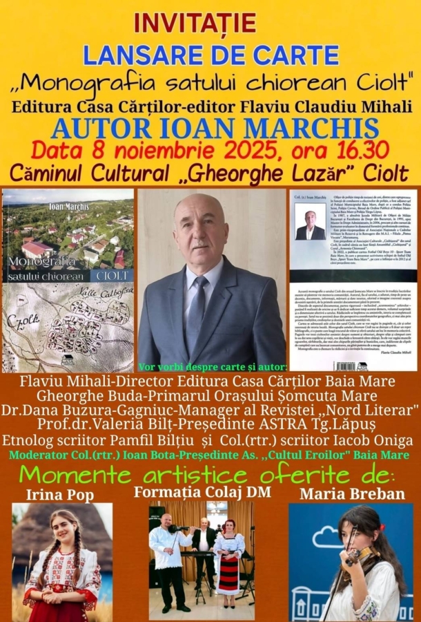 Sâmbătă, 8 noiembrie 2025, de la ora 16:30, Căminul Cultural „Gheorghe Lazăr” din Ciolt va găzdui un eveniment deosebit pentru comunitatea locală și pentru iubitorii de cultură maramureșeană: lansarea volumului „Monografia satului chiorean Ciolt”, semnat de publicistul col. (rtr.) Ioan Marchiș. Cartea apare la Editura Casa Cărților din Baia Mare, sub îngrijirea editorului Flaviu Claudiu Mihali.