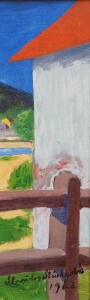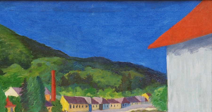 spaţiului plastic, unde zidul masiv al unei case redat în gri neutru, parcă refuză participarea la efervescenţa cromatică a ansamblului. Este aici singurul spaţiu din tablou unde pictorul lasă voit ochiul privitorului, după ce a parcurs prim-planul de la stânga la dreapta, să ia o pauză, un respiro, timp în care privirea îi este dirijată în sus până la colţul acoperişului situat în colţul din dreapta-sus al spaţiului plastic, unde te cheamă şi te aşteaptă acea pată de roşu vermillon, care după ce te încarcă energetic te trimite plonjat înapoi, din colţul dreapta sus spre mijlocul lucrării în freamătul tumultului cromatic al tabloului, îmbiindu-te să consumi energetic imaginea compoziţiei şi prin aceasta să trăieşti pe deplin bucuria pământului, a apei şi a aerului, specifice locului.
