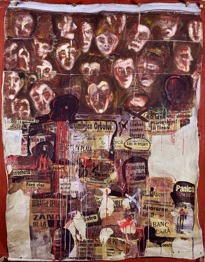 Acest al doilea segment tematic și ideatic este stratat în registrul inferior al lucrării, acolo unde o vastă suprafață utilă a suportului pictural este „încărcată” cu numeroase colaje de tipărituri, suprapictate pe alocuri, decupate din ziarele presei vremii și juxtapuse într-o aglomerare de titluri, texte gazetărești și imagini puternic fragmentate, dar a căror lectură mozaicată restituie câte cea din „bombardamentul informațional” abătut, în acei ani, asupra cetățeanului comun, slujbaș și elector în același timp.