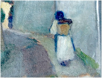 Mai este de menționat, ca element important în structura compoziției, prezența motivului antropomorf, un personaj feminin care însuflețește tabloul și se constituie în alt centru de interes al compoziției, o țărancă cu coșul în spate care se îndreaptă către piață și care prin deplasarea ei subliniază și susține direcția principală de