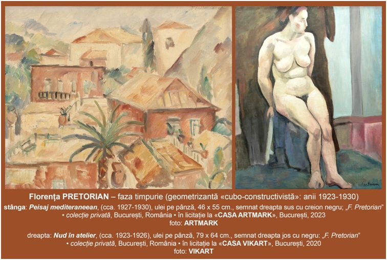 Interesant se dovedește faptul că, amintitul vocabular pictural «cubo–constructivist» al peisajului citadin băimărean este întărit/„ramforsat” prin alte câteva lucrări înrudite, reintrate în circuitul public și în cel comercial oficial, în anii din urmă. Ele ilustrează, alături de peisajul citadin băimărean, aspectul, cu totul neobișnuit, al parcurgerii în sens invers, de către Florența Pretorian, al traseului firesc de evoluție stilistică: dinspre exeperiențele impresionsite și postimpresioniste către experimentări avangardiste !