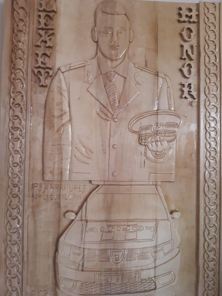 Talentul poliţistului a dat naştere, recent, unei noi sculpturi. Dacă până acum operele sale au fost inspirate din zona religioasă, de data aceasta imaginaţia şi mâinile dibace au transpus în lemn profesia pe care o practică de aproape 28 de ani.