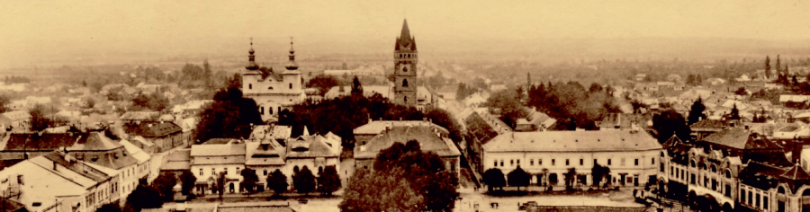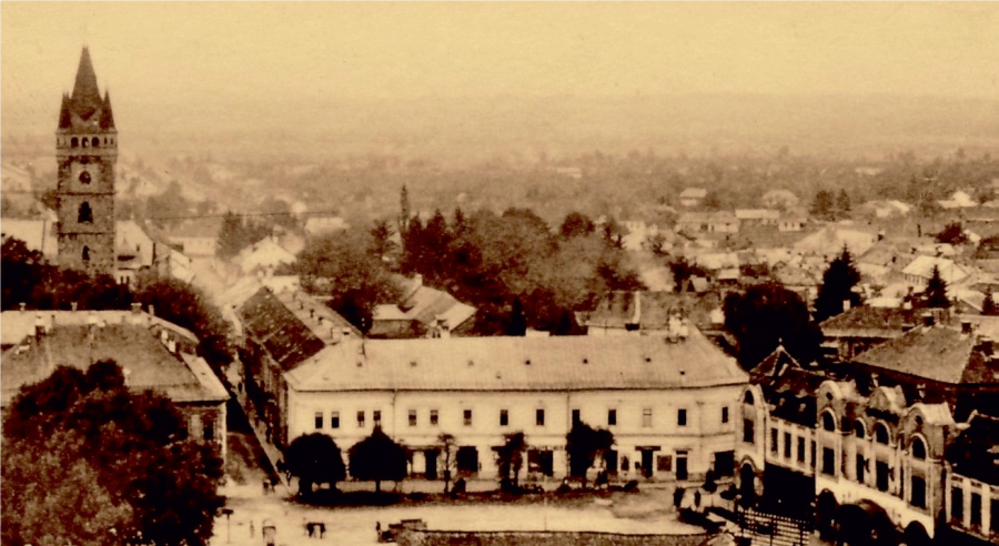 Vedere panoramică a pieței din turnul Bisericii Reformate; detaliu Claustrul Mănăstirii Minoriților, anul 1931