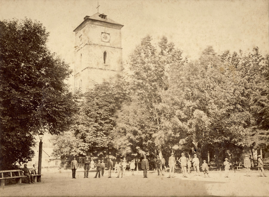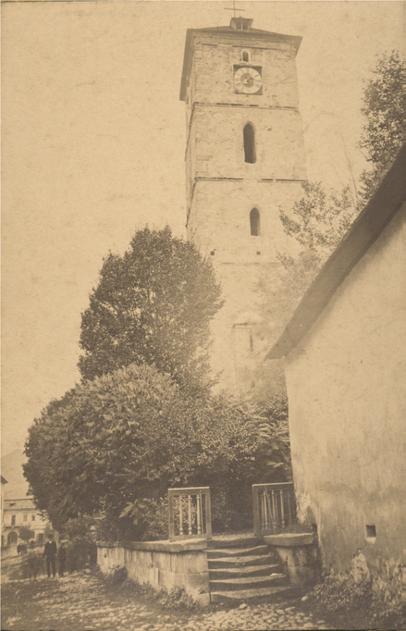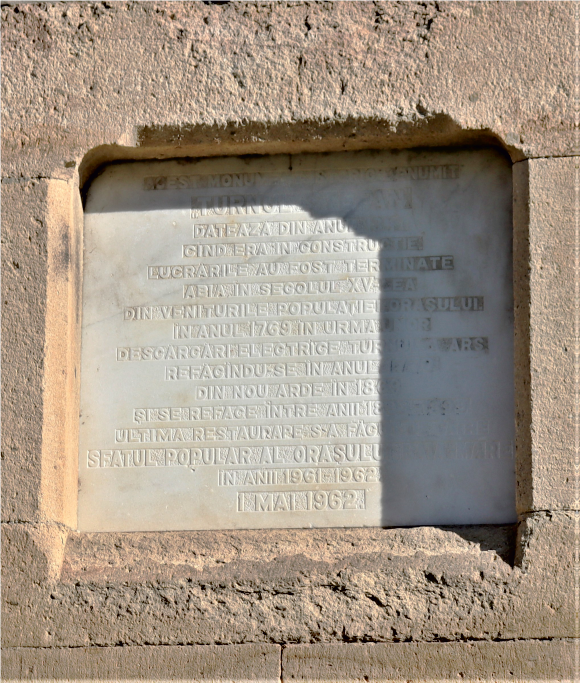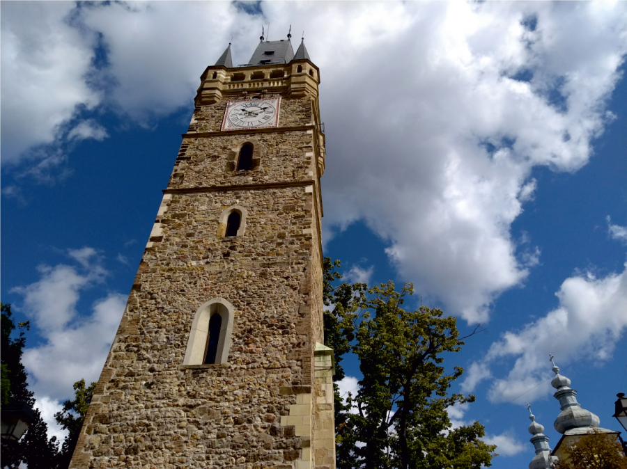 „Acest monument istoric, denumit Turnul Ştefan, datează din 1347, când era în construcţie. Lucrările au fost terminate abia în sec. al XV-lea, din veniturile populaţiei oraşului. În anul 1769, în urma unor descărcări electrice, turnul a ars, refăcându-se în anul 1770.