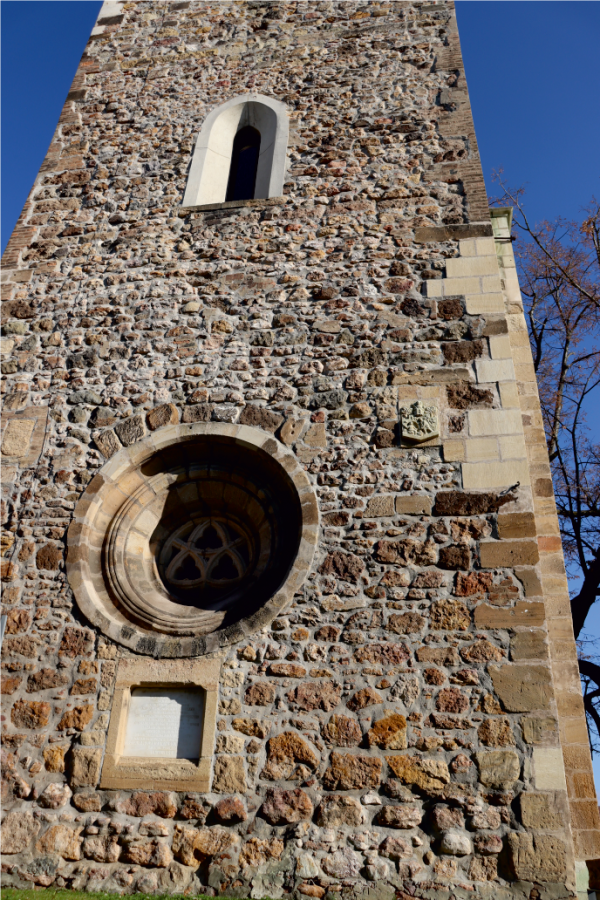 Zidurile turnului cu plan pătrat sunt mai groase decât ale bisericii și ies în fața zidurilor acesteia atât spre vest, cât și spre sud. Latura sudică și cea vestică erau libere, celelalte două fețe se găseau în interiorul edificiului. Înălțimea turnului este de 51,8 m, iar grosimea pereților variază între 2,1 şi 2,3 m.