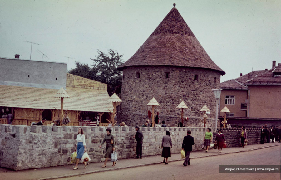 Bastionul Măcelarilor în timpul „Târgului artizanilor maramureșeni”, deschis publicului în august 1982; vedere dinspre vest