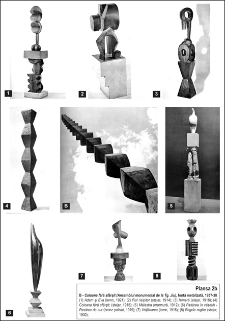 Coloana este formula găsită pentru ritmul către infinit, încercarea rece şi controlată a unui zbor. Există o sevă care o străpunge şi o hrăneşte ca şi Făt-frumosul din basme care hrăneşte pasărea în timpul zborului pentru a ajunge pe „celălalt tărâm”. Pasărea este de o puritate absolută, este visul unui zbor, este visul coloanei. Nimic raţional nu se petrece în ea, este tendinţa pură, reflex, se poate spune: zborul realizat de copil în timpul somnului său; este zborul fără naştere (fără sursă), tendinţa magică de a trece dincolo, un delir al spaţiului, spargerea limitelor. Ea arde în spaţiu şi în sine, doreşte eliberarea din materie, reîncarnarea ultimă care nu suportă în plus alte reîncarnări, este materia care-şi refuză posibilitatea unei alte existenţe şi se retrage în sine atingând nirvana, sfârşitul reîncarnărilor, această uimire de a vedea ideea, care o orbeşte pe „Domnişoara Pogany” (nimic terestru nu pot vedea ochii enormi ai Domnişoarei Pogany). Dacă pasărea este sinuciderea înaintea „imposibilului”, atunci ea este încarnarea tragediei.