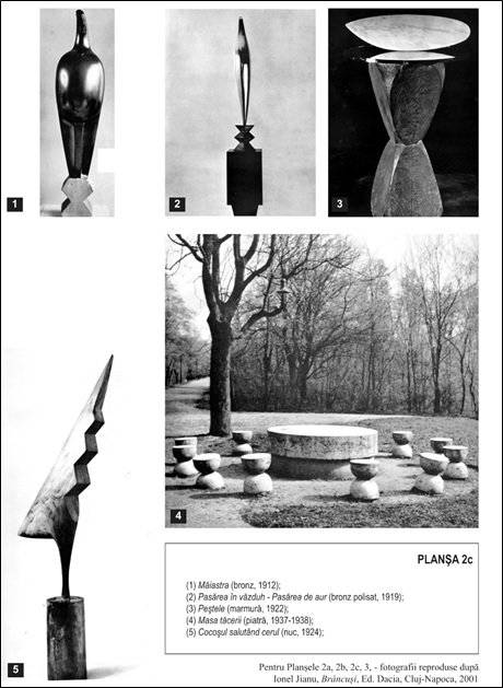 Este important de remarcat că aceste arhetipuri, genuri, aceste idei, concretizate în formele lui Brâncuşi pot fi reduse la două concepte: Coloană şi Ou. De exemplu: Cocoşul care susţine ideea de coloană, ritmul, logica, gândirea (sugerând ritmul cosmic, pulsaţia universală); „Ţestoasă zburând” se poate reduce la sferă, la ou, la fel ca şi „Animalul nocturn”. Păsările sunt o sensibilă coexistenţă între „Ou” şi „Coloană”, primele sugerând relativitatea acestor două „genuri ale genurilor”, dacă noi le putem stratifica astfel, posibilitatea de a le gândi una prin alta. Unul reduce totul la ritm, la viaţă, însemnând natură, vitalitate, celălalt este o stare potenţială de a fi, reducând totul la tăcerea primordială: acesta e opusul ritmului. (Planşele 2a, 2b şi2c)