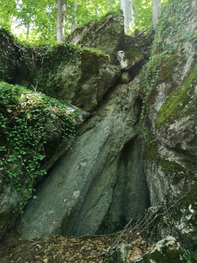 Traseul marcat cu punct roșu ne conduce apoi prin frumoase poienițe la marginea pădurii și a stâncilor iar la un moment dat o vom lua spre stânga urcând abrupt pe pietre până la intrarea în peșteră.