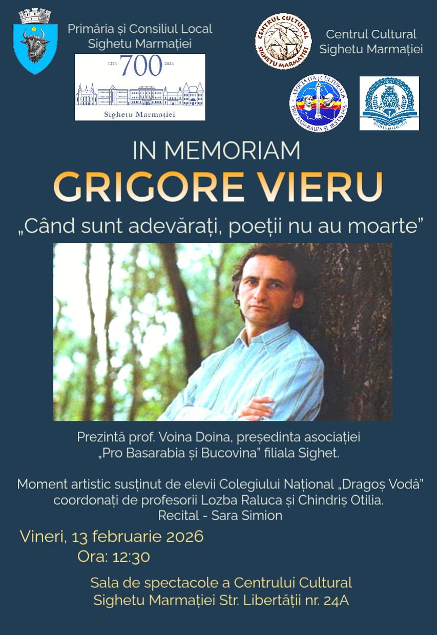 Astfel, ne exprimăm recunoștința față de un poet care a știut să transforme cuvântul în emoție și poezia în destin. Prin cântec, recitare și trăire, îl aducem pe Grigore Vieru mai aproape de noi, acolo unde i-a fost mereu locul: în inimile oamenilor”, transmit reprezentanții Centrului Cultural Sighetu Marmației.