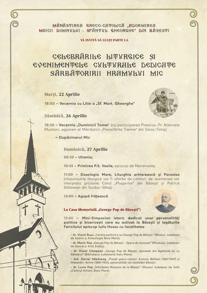 Mănăstirea Greco-Catolică „Adormirea Maicii Domnului – Sfântul Gheorghe” din Băsești vă invită să luați parte la celebrările liturgice și evenimentele culturale dedicate sărbătorii hramului mic.