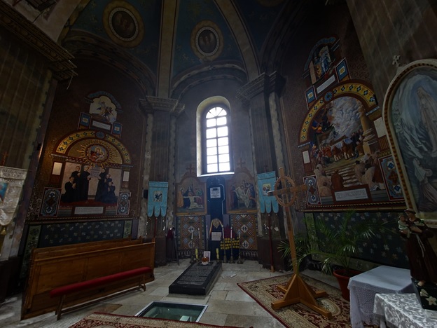 În interiorul bisericii, după o intrare construită într-un stil arhitectural romanic, împrejmuită de coloane imense de piatră, în partea stângă regăsim ceea ce pentru ctitorul bisericii – Vasile Lucaciu – reprezintă locul de veci, un veritabil altar de rugăciune la care zilnic sute de credincioși vin și se roagă. Vasile Lucaciu, o dată cu trecerea sa în neființă pe data de 29 noiembrie 1922 la Satu Mare, a fost adus și înmormântat la Șișești, chiar în ziua „pentru care a luptat atât de mult de-a lungul vieții, de 1 Decembrie”, conform celor susținute de Marioara Butica, ghidul turistic local. Datorită devotamentului său de a instaura unitatea națională, Vasile Lucaciu este denumit de către comunitatea șișeșteană „leul de la Șișești”. Tot în acest loc sunt înmormântați și soția preotului, Paulina Lucaciu și fiul său Epaminonda.