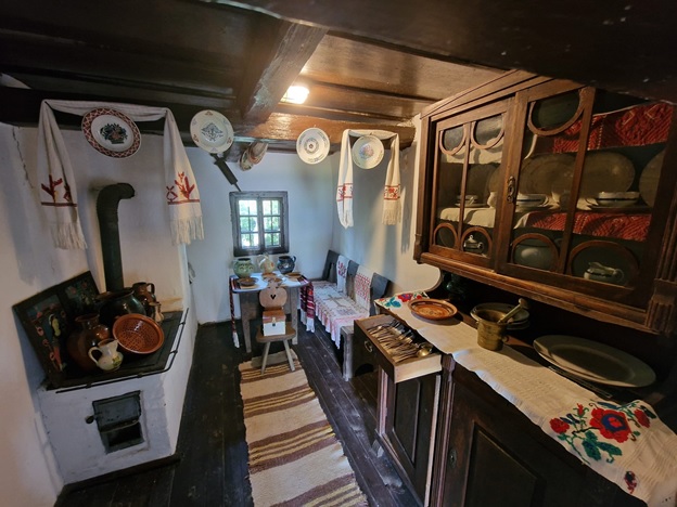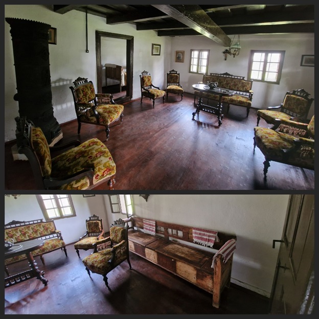 Astfel, după o „tindă” specifică locuințelor vremii respective, dintr-un hol pe cât de mic, pe atât de special, suntem introduși într-o încăpere cu o ambianță intelectuală, întrucât aici se află atât biroul, cât și biblioteca preotului, un loc care găzduiește o întreagă colecție a publicațiilor vremii, dintre care enumerăm: „Tribuna”, „Observatorul”, „Gazeta Transilvaniei”, „La civilta cattolika” ș.a.m.d. În cealaltă parte a casei întâlnim bucătăria, o odaie decorată în stil tradițional românesc. În acest loc, printre „ciucurii” ștergarelor regăsim o multitudine de produse realizate din ceramică, atât de apreciate astăzi, dar și mobilierul specific printre care amintim dulapul cu vitrină, cunoscut în mentalitatea populară sub denumirea de „credenț”. După o zi încărcată, odată ce ceaiul era gata, pentru oamenii satului salonul casei reprezenta locul perfect pentru a-și vărsa fiecare în parte năduful, loc în care „lumea punea țara la cale”, informează Marioara Butica. Tot în acest salon, la nivelul tavanului, pe una dintre grinzile care segmentează orizontal încăperea se găsește scris în alfabetul chirilic un enunț pe care-l putem considera drept „piatra de temelie” a edificiului: „Această casă preoțească este construită de către sătenii din satul Fișești în anul 1838”- denumirea originală a satului în vremea respectivă. Un ultim detaliu prețios, inconfundabil când vine vorba de autenticitatea Muzeului, îl reprezintă și dormitorul de o simplitate caracterizată prin existența doar a unui singur pat de paie, situat în apropierea ferestrei.