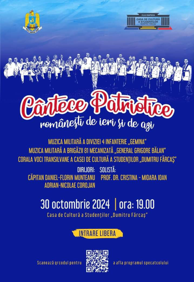 Miercuri, 30 octombrie 2024, ora 19.00, la Casa de Cultură a Studenților „Dumitru Fărcaș” Cluj Napoca va avea loc spectacolul „Cântece patriotice românești de ieri și de azi”. Vor urca pe scenă: Muzica Militară a Diviziei 4 Infanterie „Gemina”, Muzica Militară a Brigăzii 81 Mecanizată „General Grigore Bălan” și Corala Voci Transilvane a Casei de Cultură a Studenților „Dumitru Fărcaș”. Solista evenimentului va fi prof.dr.Cristina-Mioara Ioan, vocea Fanfarei Municipale Baia Mare, de aproape 20 de ani. În această seară, ea va transmite publicului clujean bucurie și emoție, prin glasu-i expresiv și inconfundabil.