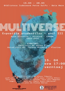 Luni, 15 aprilie 2024, ora 17.00, la Salonul artelor din incinta bibliotecii județene va fi organizat vernisajul Expoziției de pictură „Multiverse”. Lucrările aparțin studenților anului III a Facultății de Arte Plastice din cadrul Centrului Universitar Nord Baia Mare. În organizarea evenimentului și-a adus aportul Biblioteca Județeană „Petre Dulfu” Baia Mare.
