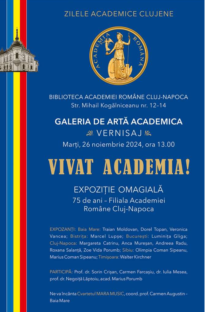 Marți, 26 noiembrie 2024, ora 13.00, la Galeria de Artă Academica din Cluj Napoca va avea loc vernisajul „Vivat Academia!”. Evenimentul este unul omagial, care sărbătorește 75 de ani de la înființarea Filialei Academiei Române Cluj Napoca. Vor expune lucrări artiști din 6 localități ale țării: Baia Mare, Cluj Napoca, București, Bistrița, Sibiu și Timișoara. Baia Mare va fi reprezentată de: Traian Moldovan, Dorel Topan și Vera Vancea.