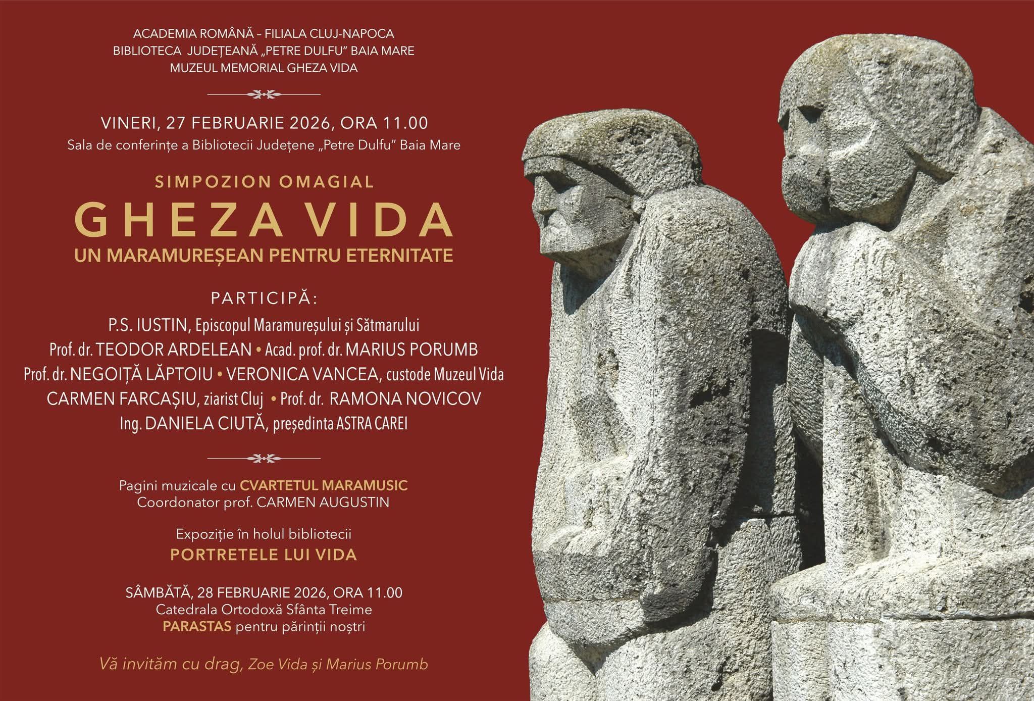 Vineri, 27 februarie, de la ora 11:00, Sala de conferințe a Bibliotecii Județene „Petre Dulfu” devine spațiul memoriei și recunoștinței, găzduind Simpozionul omagial „Gheza Vida – un maramureșean pentru eternitate”.