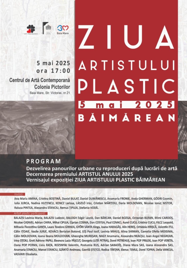 Cu această ocazie, la Centrul de Artă Contemporană „Colonia Pictorilor” din Baia Mare vor avea loc: dezvelirea panourile urbane cu reproduceri după lucrări de artă, decernarea premiului „Artistul anului 2025” și vernisajul expoziției „Ziua Artistului Plastic Băimărean”, în data de 5 mai.