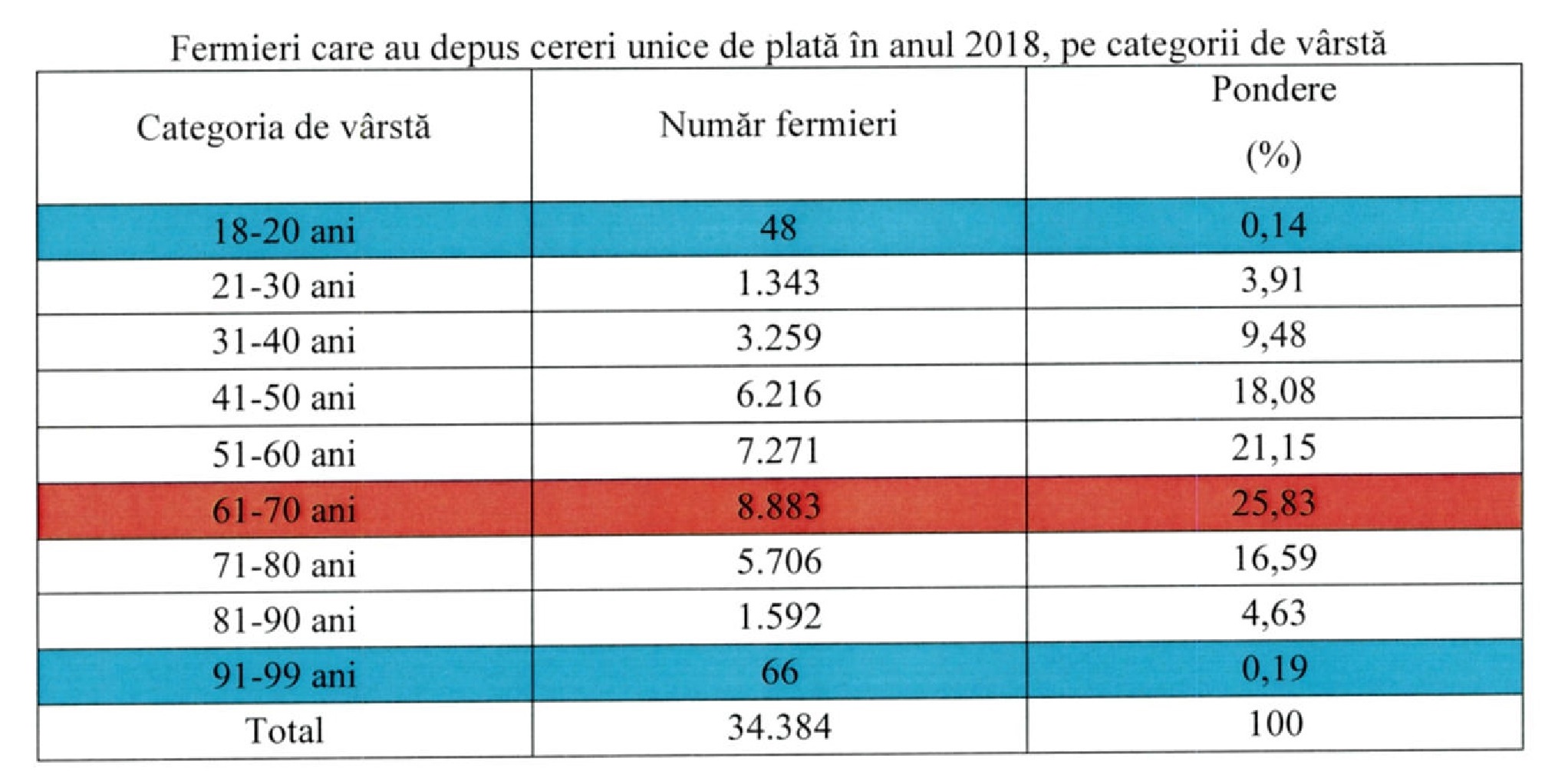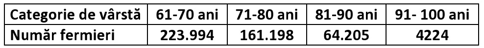 Datele deținute de Ministerul Agriculturii și Dezvoltării Rurale (MDAR) arată că, în acest an, 866.000 de fermieri au depus cereri unice de plată la APIA. Dintre aceștia, mai bine de jumătate (mai exact 453.630 fermieri) au vârste mai mari de 60 de ani. Sunt chiar și 4.224 de solicitanți care au vârste cuprinse între 91 și 100 de ani!