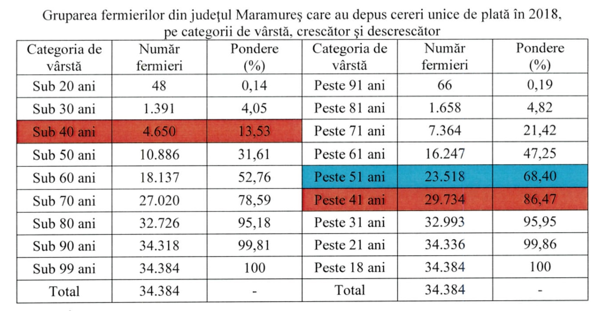 În Maramureș, lucrurile nu diferă prea mult de media europeană sau cea națională. Spectaculoasă e situația la extremele categoriilor de vârstă: avem 66 de fermieri foarte vârstnici (de 91-100 ani) și doar 48 de fermieri foarte tineri (de 18-20 de ani). Desigur situația se referă la cei care au făcut cereri de plată unice la APIA.