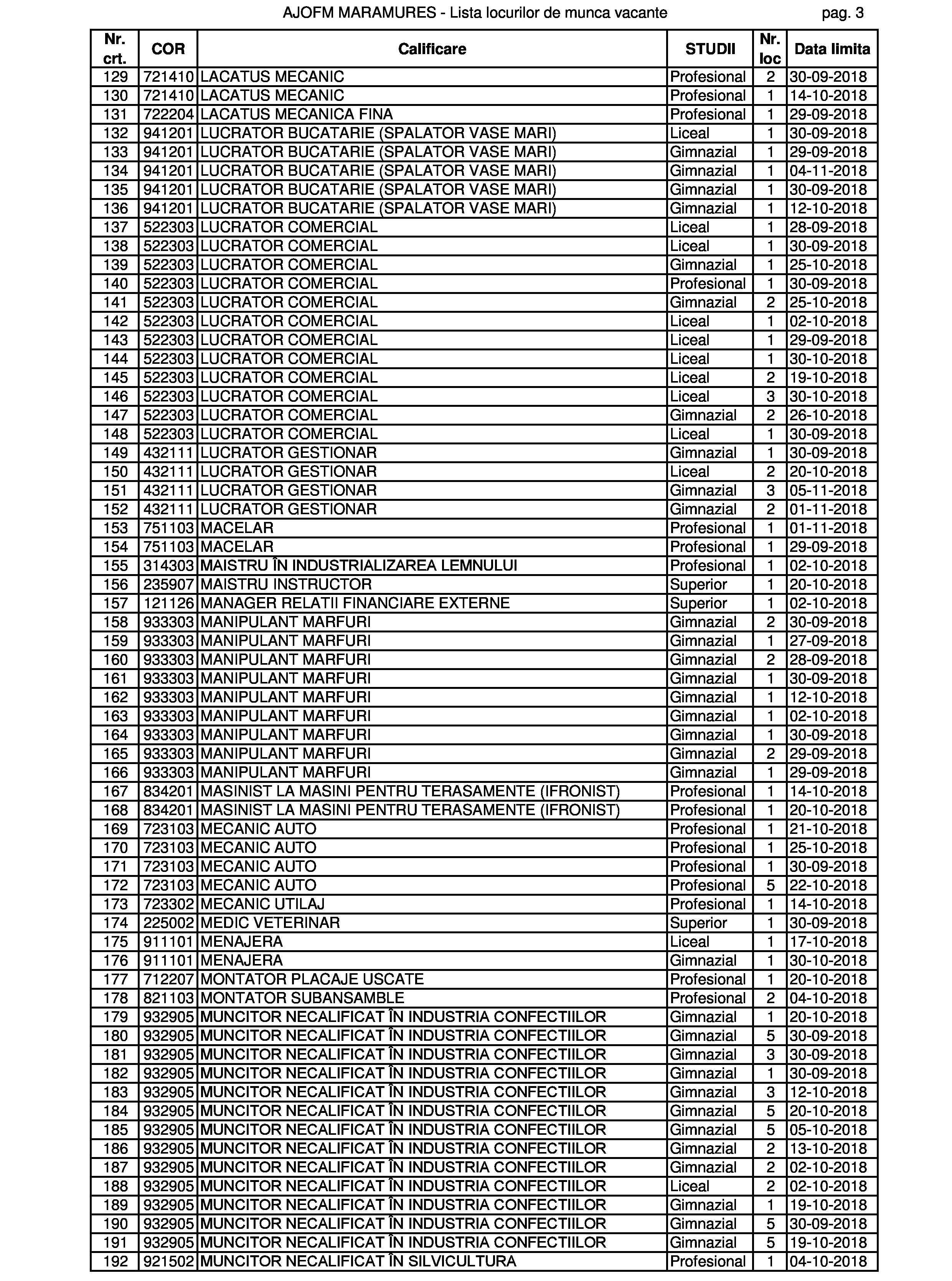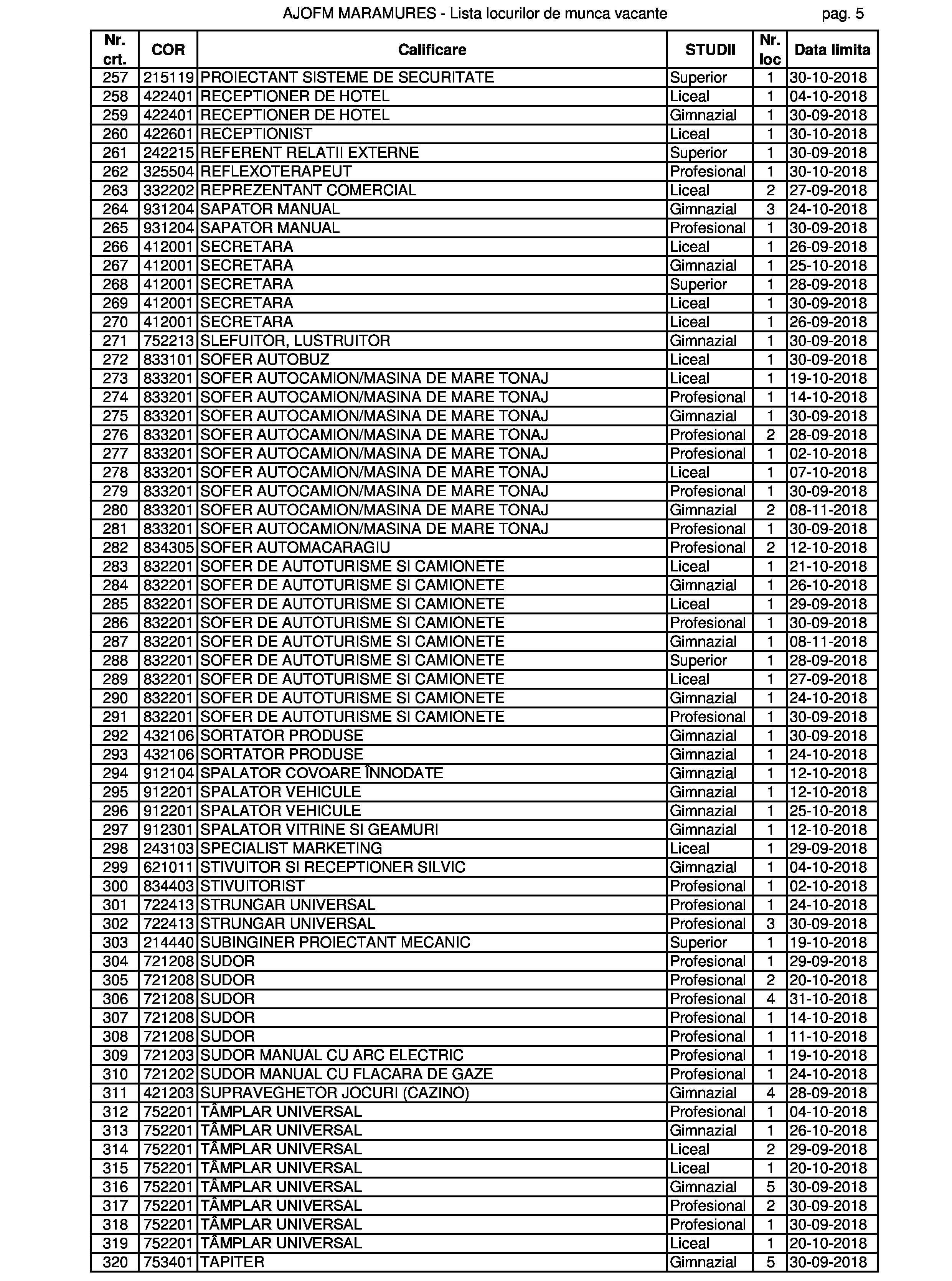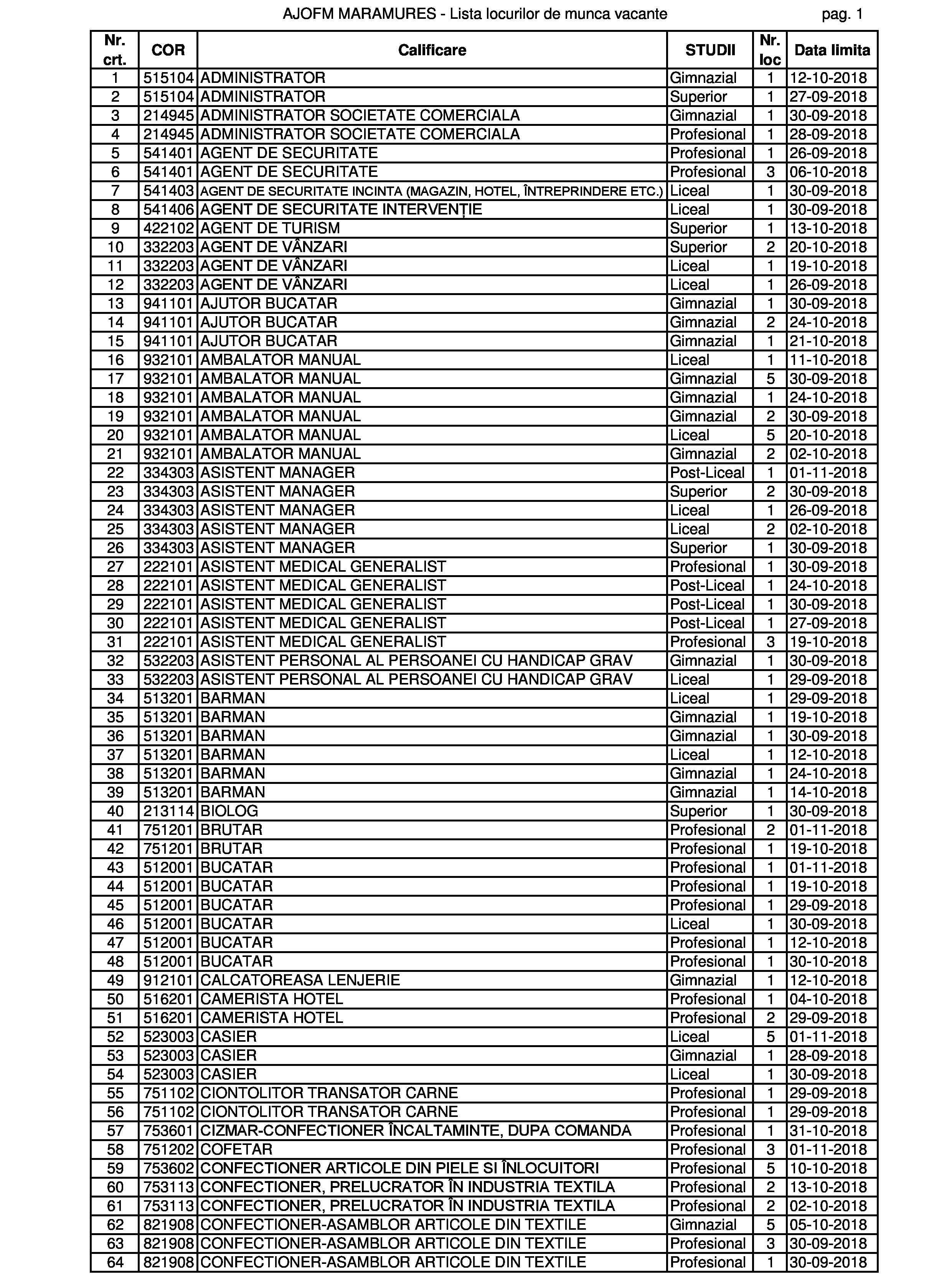 Numai dacă nu vrei nu ai unde să lucrezi. Așa s-ar părea dacă ar fi să analizăm lista săptămânală a locurilor de muncă publicată de Agenția Județeană pentru Ocuparea Forței de Muncă (AJOFM) Maramureș. Mai ales că față de săptămâna trecută, oferta de joburi a crescut cu aproximativ 25%. Din păcate, în jur de 100 de anunțuri de angajare sunt pentru persoanele necalificate și alte peste 300 vizează persoanele cu puțină școală (studii gimnaziale, liceale sau profesionale).. Totuși, sunt și câteva posturi (director, agent vânzări, profesor, proiectant, inginer) pentru cei care au absolvit o facultate.