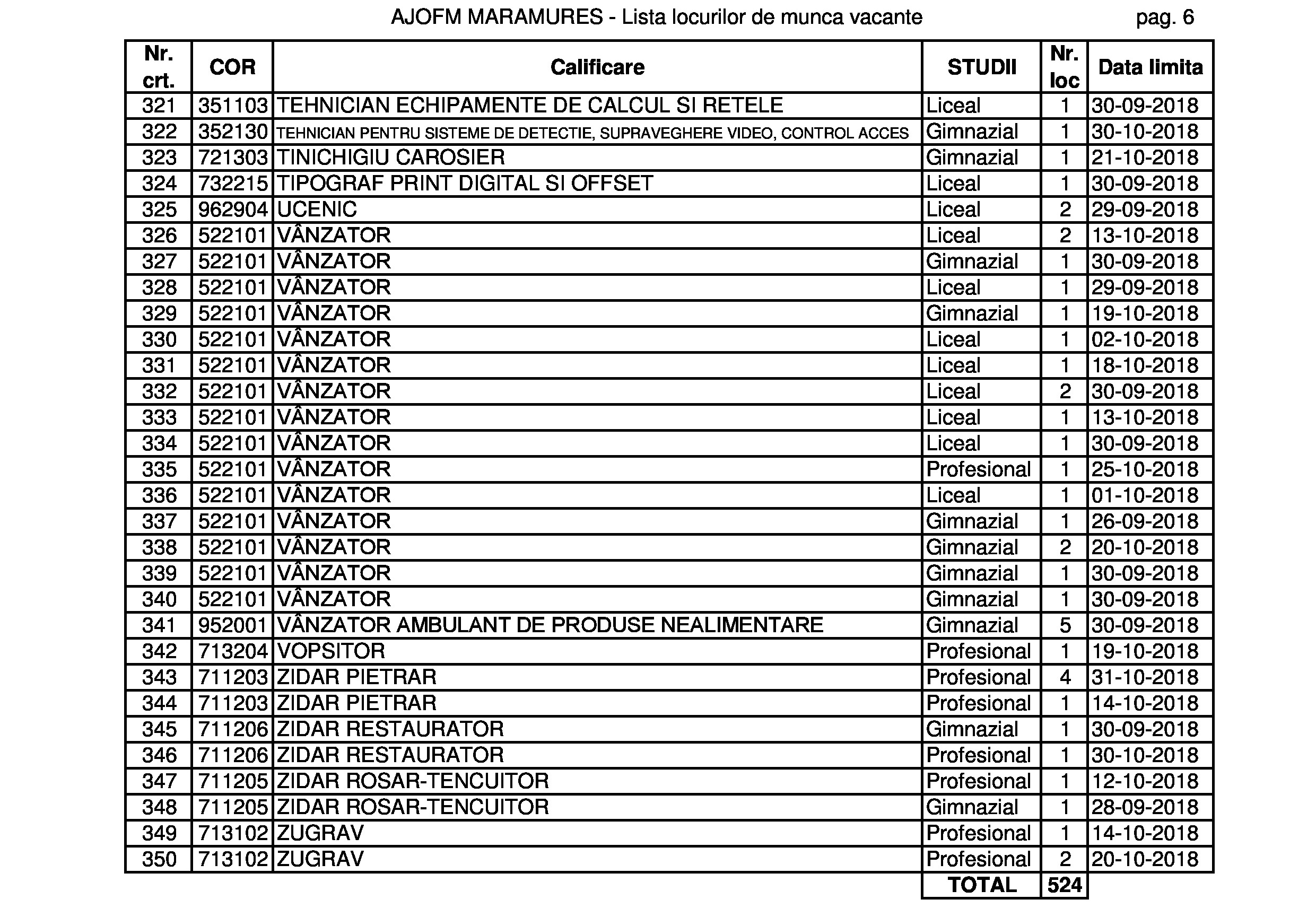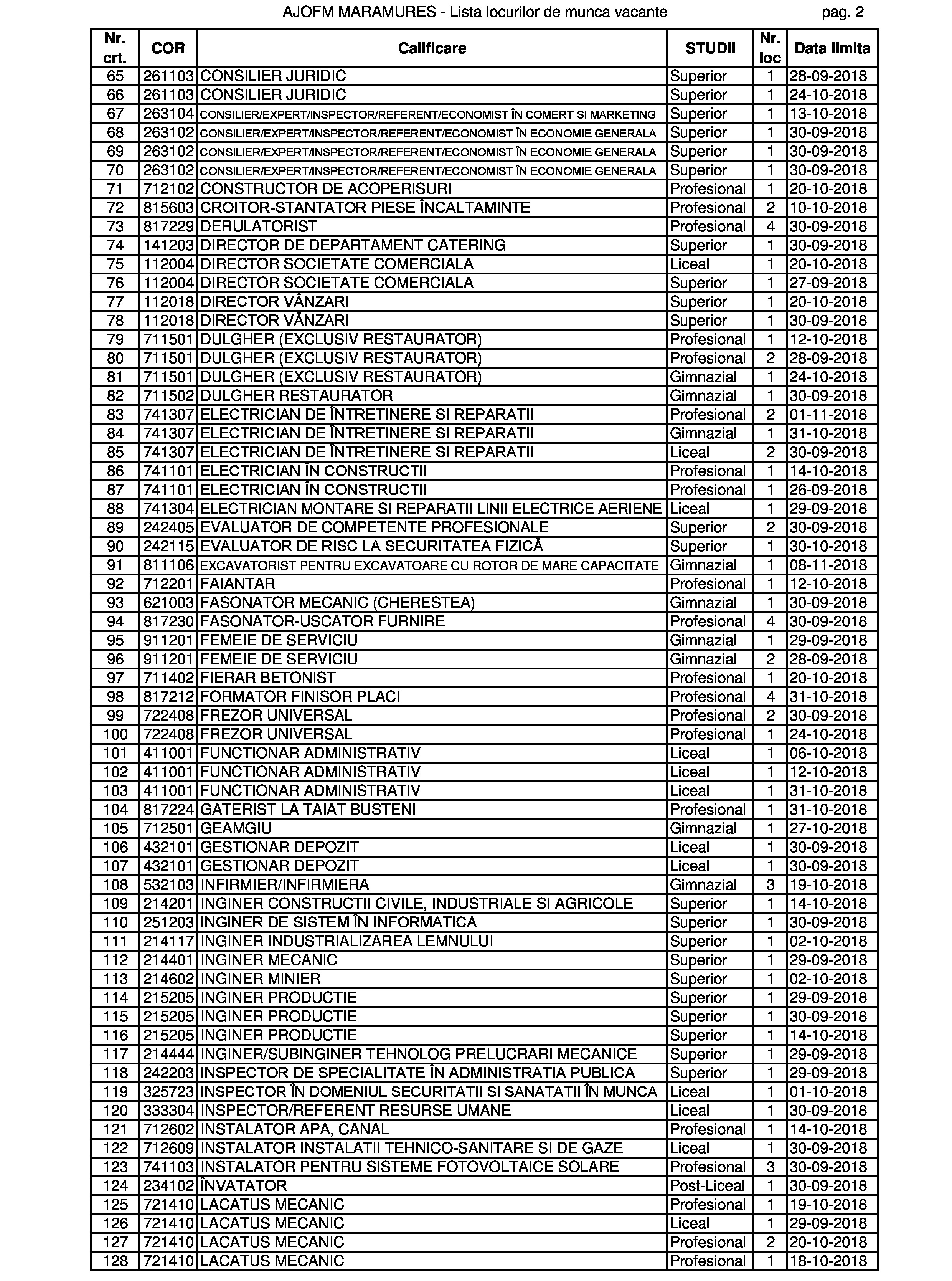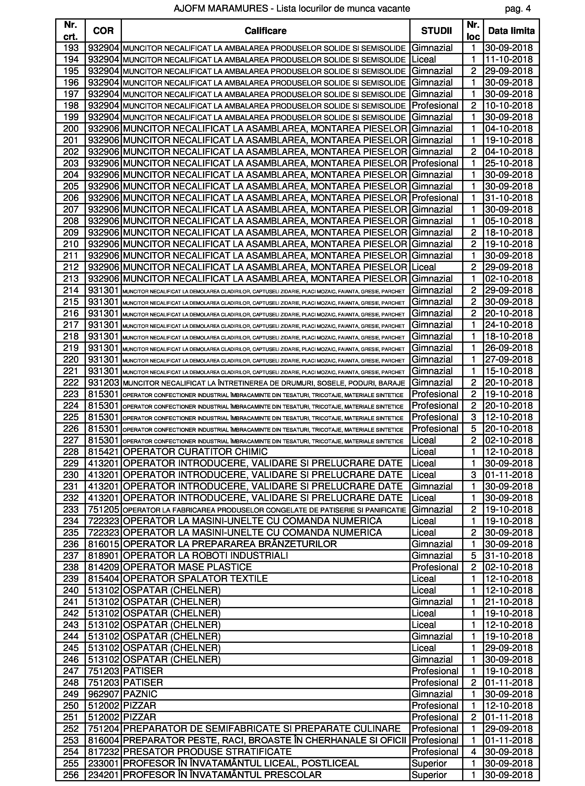 Numai dacă nu vrei nu ai unde să lucrezi. Așa s-ar părea dacă ar fi să analizăm lista săptămânală a locurilor de muncă publicată de Agenția Județeană pentru Ocuparea Forței de Muncă (AJOFM) Maramureș. Mai ales că față de săptămâna trecută, oferta de joburi a crescut cu aproximativ 25%. Din păcate, în jur de 100 de anunțuri de angajare sunt pentru persoanele necalificate și alte peste 300 vizează persoanele cu puțină școală (studii gimnaziale, liceale sau profesionale).. Totuși, sunt și câteva posturi (director, agent vânzări, profesor, proiectant, inginer) pentru cei care au absolvit o facultate.