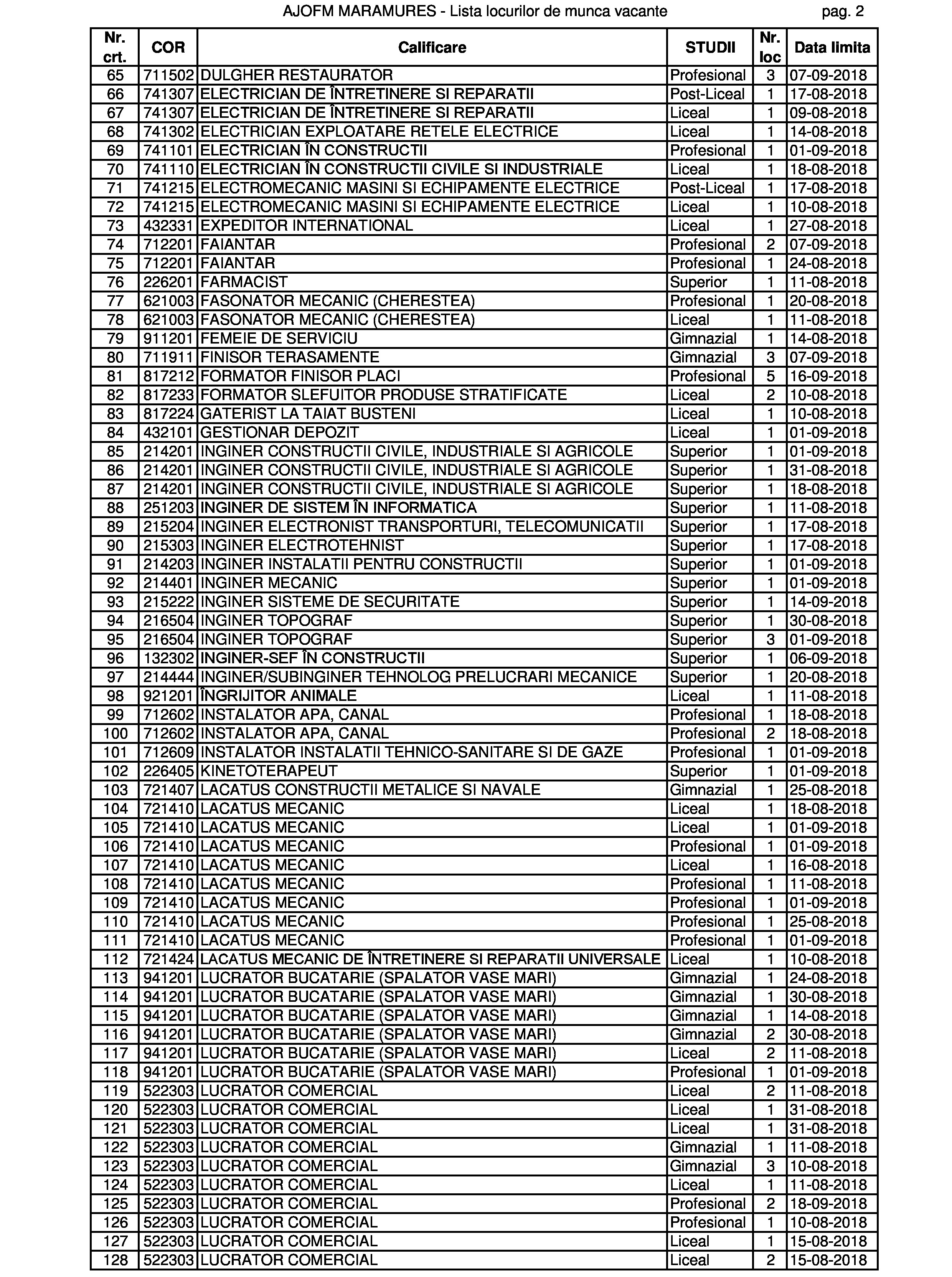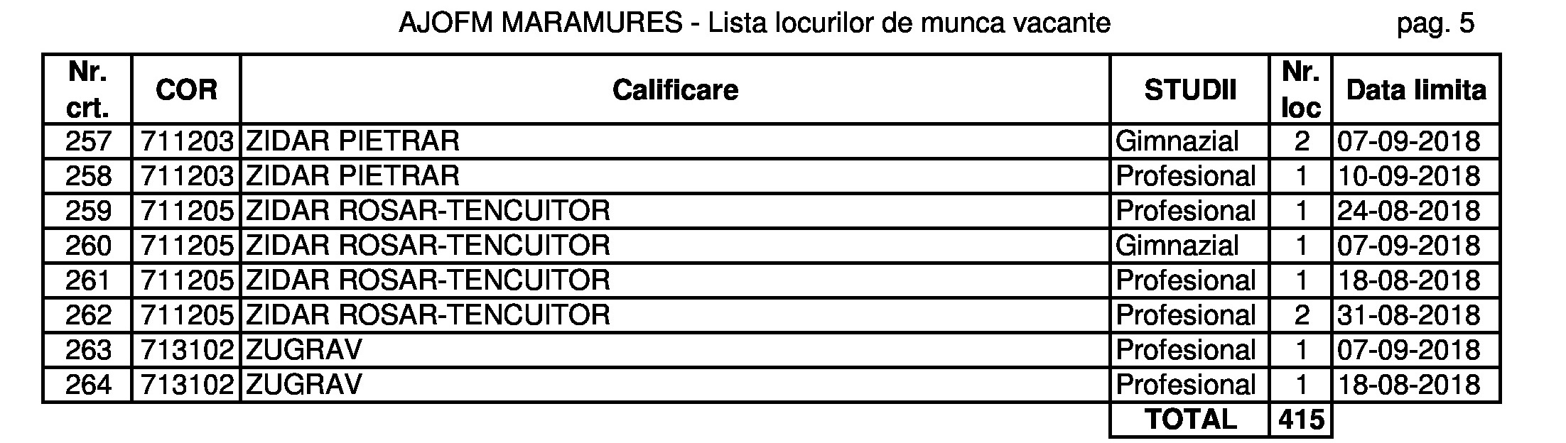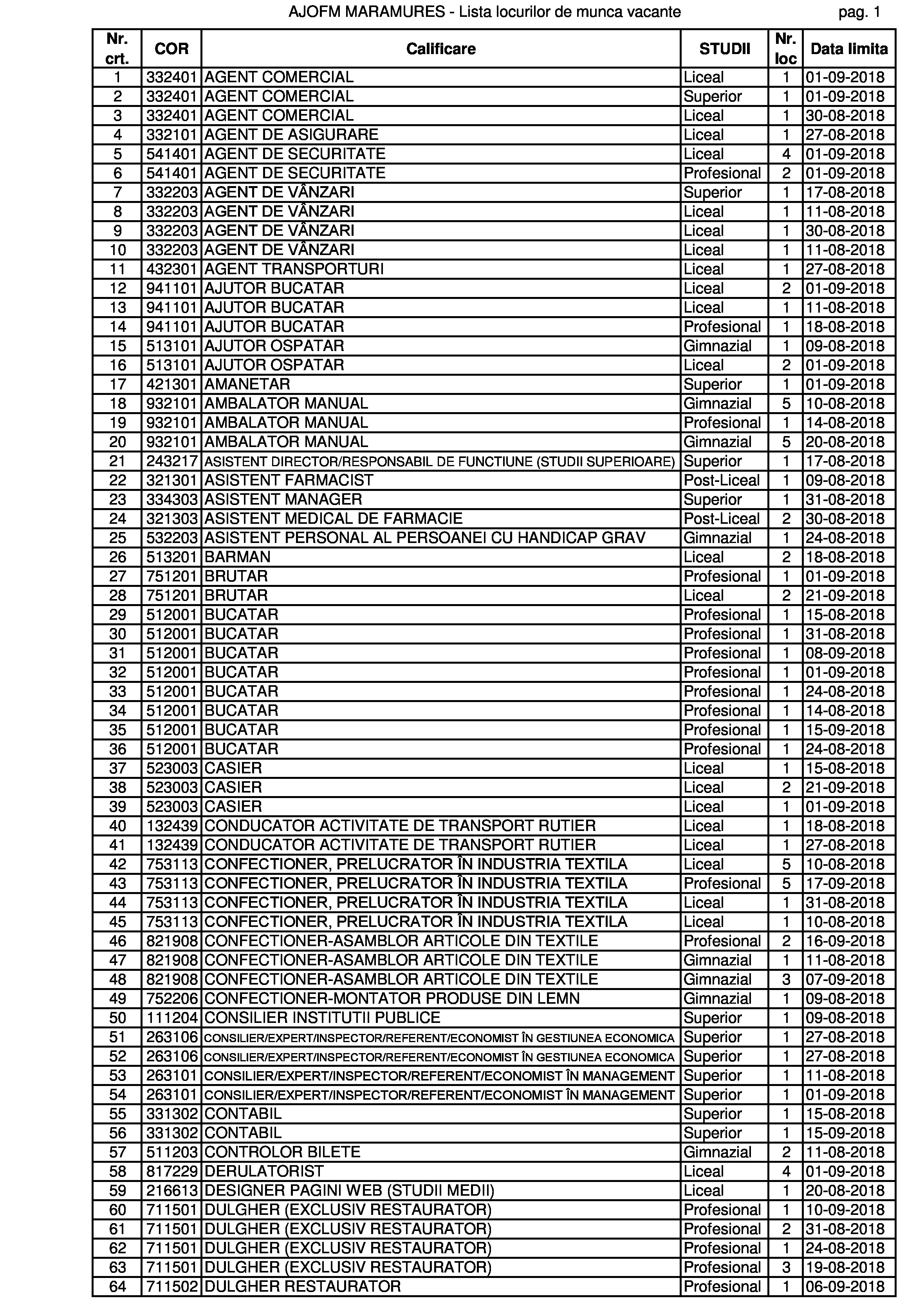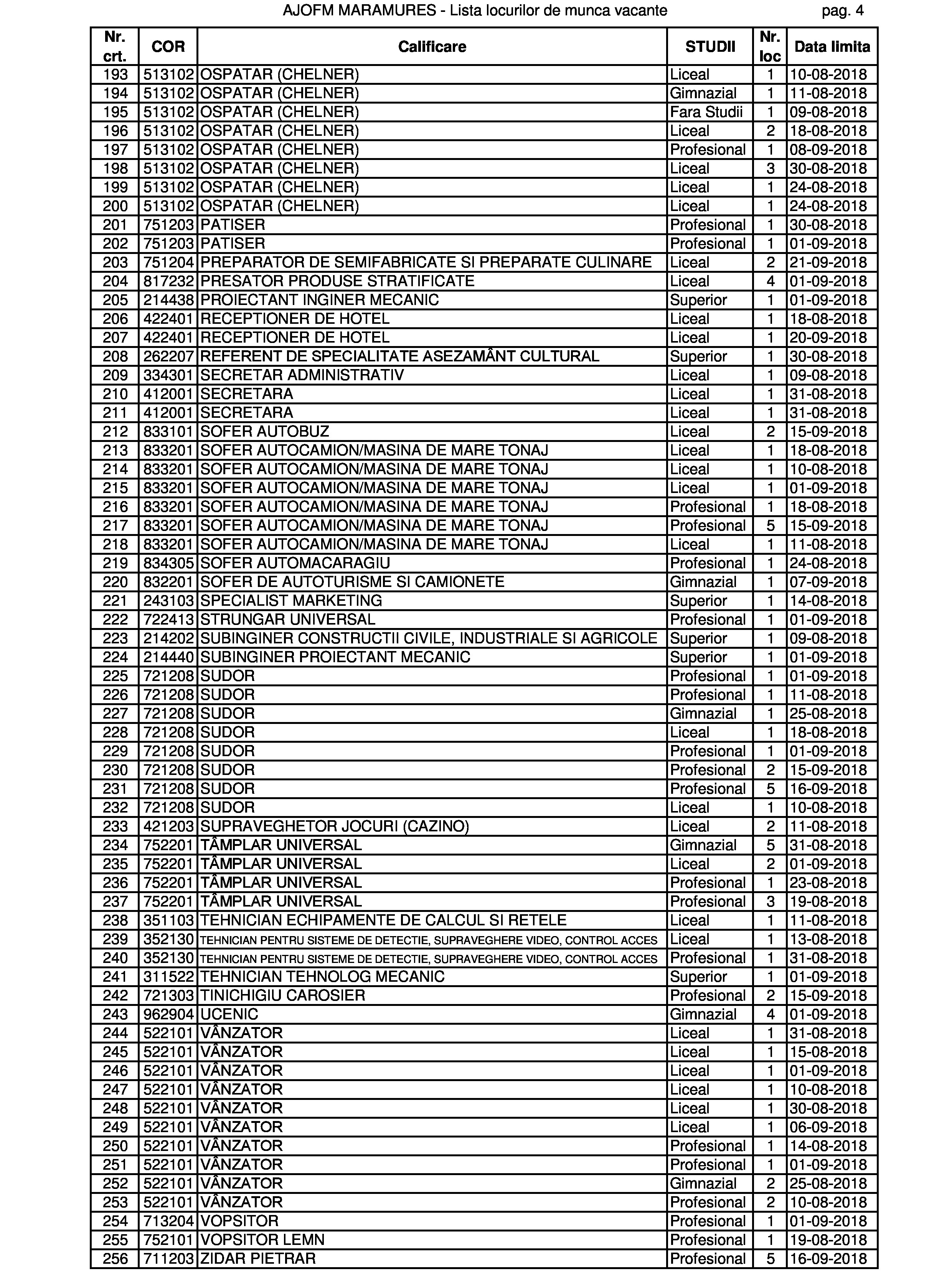 Un număr de 415 locuri de muncă sunt disponibile în județ, potrivit Agenției Județene pentru Ocuparea Forței de Muncă (AJOFM). Majoritatea joburilor vizează persoanele necalificate și cele cu studii medii. Se fac angajări în unități de alimentație publică, unde se caută bucătari, barmani, ospătari, dar și personal necalificat, la spălat vase. Este nevoie de personal și în sănătate, fiind disponibile posturi de asistent farmacist, asistent medical, farmacist, kinetoterapeut. Totodată, rețeaua comercială așteaptă câteva zeci de lucrători. În listă figurează și 15 posturi libere de șofer. Iată și oferta detaliată: