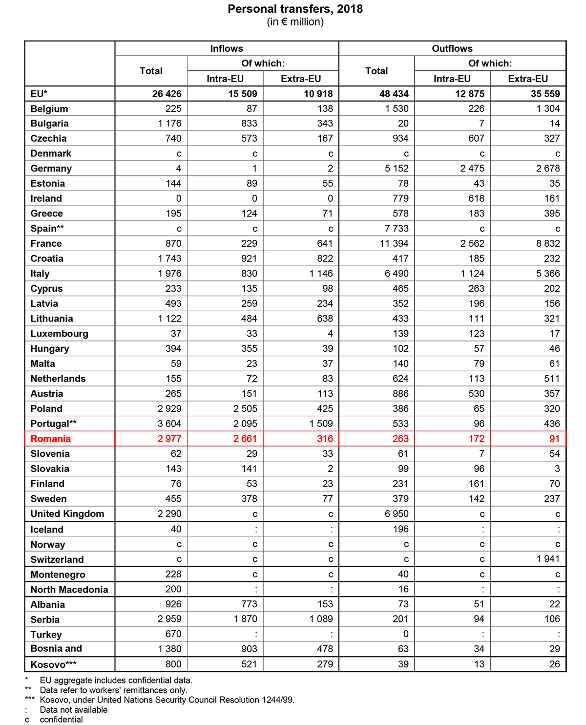 Tot în 2018, din România s-au trimis spre alte țări 263 de milioane de euro: 172 în interiorul UE, iar 91 în afara ei. Facând diferența, rămân intrați în România 2.714 miliarde de euro.