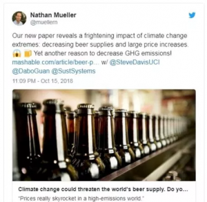 „Studiul nostru arată un impact înspăimântător al schimbărilor climatice extreme: scăderea ofertei de bere și un preț tot mai mare al acesteia. Iată un alt motiv pentru a diminua emisiile de noxe care creează efectul de seră” – a scris pe twitter profesorul Nathan Mueller. Practic, cercetătorul american îi invită pe băutorii de bere să-și apere licoarea preferată și să militeze pentru diminuarea emisiilor de noxe.