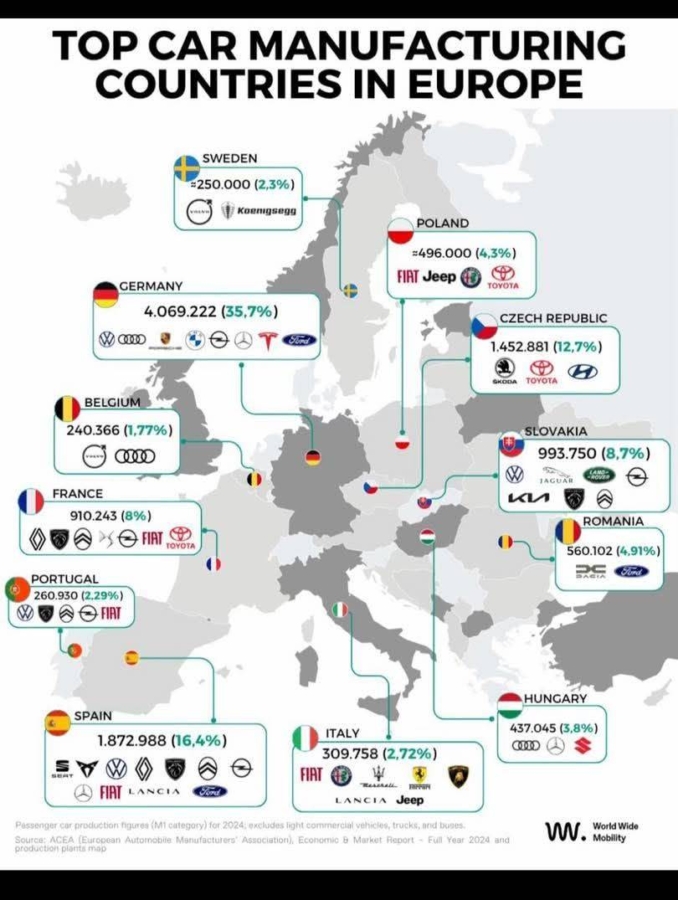 Privind harta producției de automobile din Europa, România ocupă un loc care poate fi considerat modest, dar cu semnificație strategică: 560.102 autoturisme produse în 2024, ceea ce reprezintă aproximativ 4,91% din producția europeană. În timp ce țări precum Germania, Spania sau Cehia domină topurile, cu milioane de mașini produse anual, România se află în zona de mijloc, ușor mai sus decât Polonia și Ungaria.
