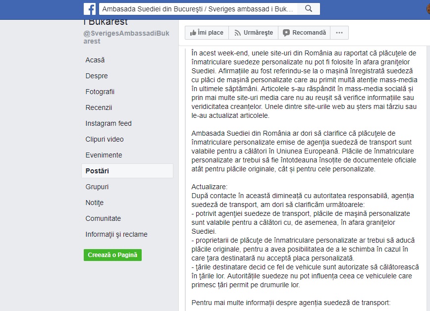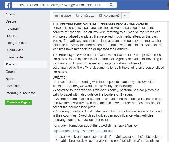 Colac peste pupăză, intră în joc și Ambasada Suediei la București care postează pe pagina sa de internet: ”Ambasada Suediei din România ar dori să clarifice că plăcuţele de înmatriculare personalizate emise de agenţia suedeză de transport sunt valabile pentru a călători în Uniunea Europeană. Plăcile de înmatriculare personalizate ar trebui să fie întotdeauna însoțite de documentele oficiale atât pentru plăcile originale, cât și pentru cele personalizate”. Presupun că, între timp, celor de la ambasada Suediei li se transmite de la Stockhom ceva de genul. ”Fiți mai diplomați. Vedeți că, în numărul de înmatriculare, la final e vorba de partidul care în 2001 a ratificat Acordul dintre România şi Suedia privind reglementarea pretenţiilor suedeze.pentru fabrica de chibrituri. Iar România a plătit 120 de milioane de dolari, în patru tranşe egale, datoria către noi fiind stinsă în totalitate în 2003, deși ne luasem gândul de la banii aștia. Așa că dați-o și voi mai pe după cireș, cum se spune pe acolo”. Și ambasada a dat-o pe după cireș printr-o actualizare, tot pe facebook.