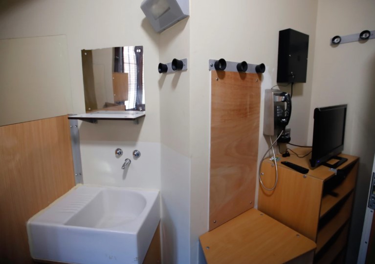 Celula are dimensiuni reduse — circa 9 metri pătraţi — şi include duş, toaletă, birou şi televizor, într-o zonă special amenajată.