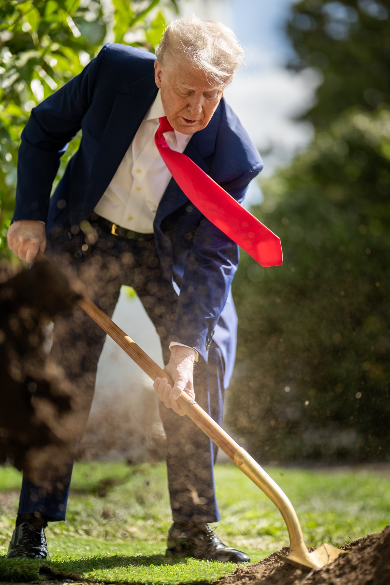 Nu era un grădinar, ci președintele Donald Trump, fotografiat atent, într-o postură studiată, cu mânecile suflecate și privirea îndreptată spre aparatele de fotografiat. Liderul american săpa.
