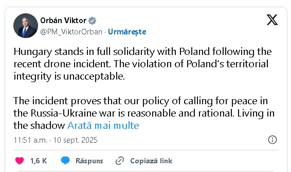 „Ungaria își exprimă solidaritatea deplină cu Polonia în urma recentului incident cu drona. Încălcarea integrității teritoriale a Poloniei este inacceptabilă. Incidentul dovedește că politica noastră de a cere pace în războiul dintre Rusia și Ucraina este rezonabilă și rațională. A trăi în umbra unui război este plin de riscuri și pericole. Este timpul să punem capăt acestui lucru! În acest scop, susținem eforturile președintelui Donald Trump care vizează realizarea păcii.”