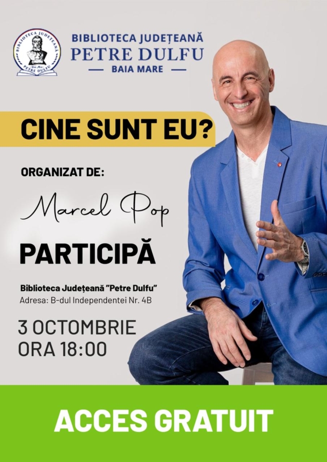 Joi, 3 octombrie, ora 18.00, în Sala de conferințe a Bibliotecii Județene „Petre Dulfu” va avea loc conferința „Cine sunt eu?”, prezentată de Marcel Pop, specialist Școala de Feng Shui.