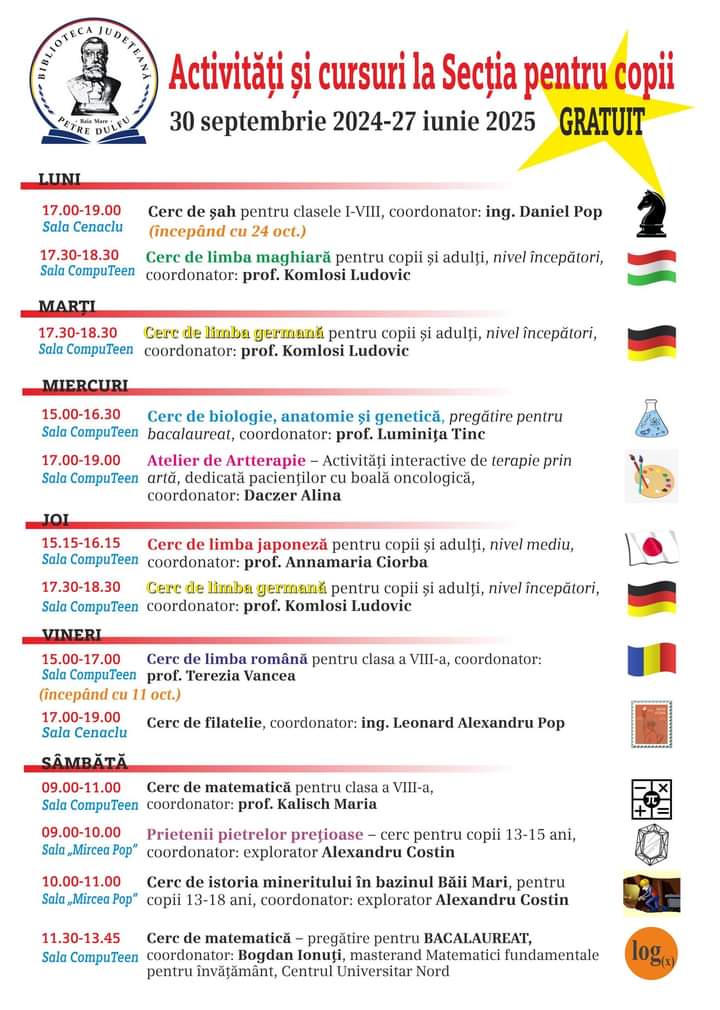 În perioada 30 septembrie 2024 – 27 iunie 2025, Biblioteca Județeană „Petre Dulfu”, Secția pentru copii va organiza activități și cursuri gratuite, atât pentru elevi, cât și pentru adulți. Acestea vor fi variate și v
