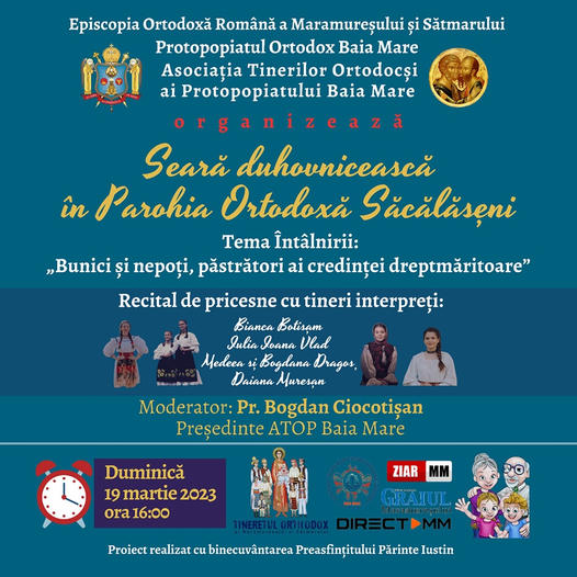 Cu binecuvântarea Preasfințitului Părinte Iustin, duminică, 19 martie (a Sfintei Cruci), cu începere de la ora 16:00, la biserica ortodoxă din Săcălășeni va avea loc o Seară Duhovnicească cu tema „Bunici și nepoți, păstrători ai credinței dreptmăritoare”.