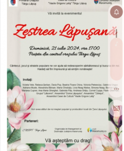Duminică, 21 iulie 2024, ora 17.00, în piațeta din centrul orașului Târgu Lăpuș se va organiza evenimentul cultural „Zestrea Lăpușană. Meșterii populari din Țara Lăpușului își vor etala creațiile,